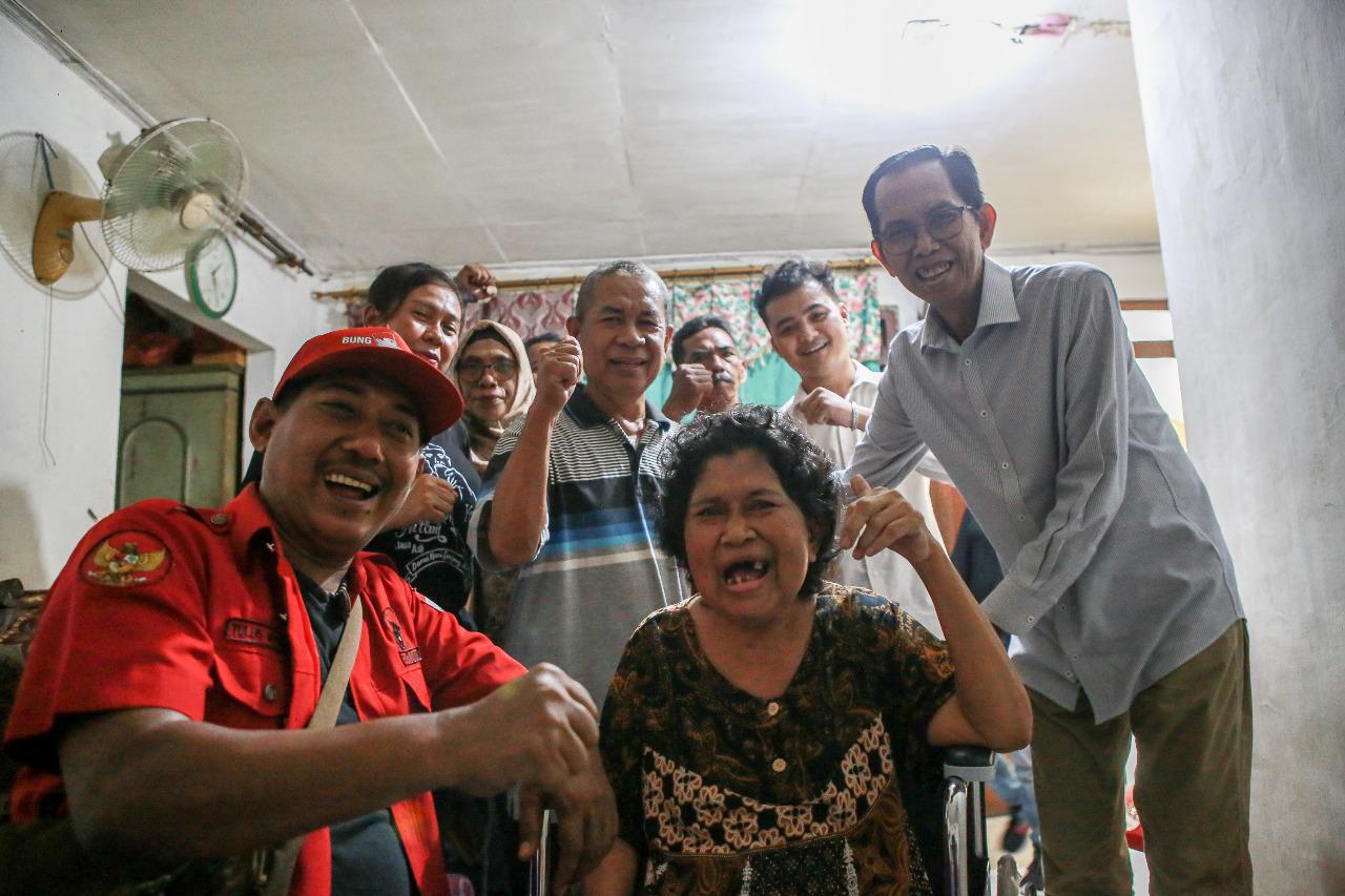 Adi Sutarwijono dengan kader-kader banteng Lakarsantri datang untuk memberikan bantuan kursi roda. “Apakah Ibu Markammah gembira dapat kursi roda,” tanya Adi.
