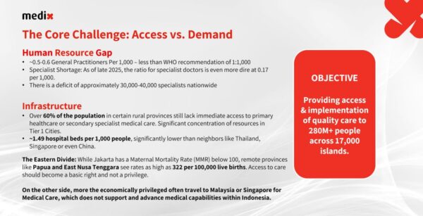 Medix memandang Indonesia sebagai salah satu pasar strategis di Asia Tenggara, seiring pertumbuhan ekonomi dan meningkatnya kebutuhan layanan kesehatan. Namun, Sigal menegaskan bahwa pertumbuhan ekonomi harus diiringi dengan sistem kesehatan yang efisien dan inklusif.